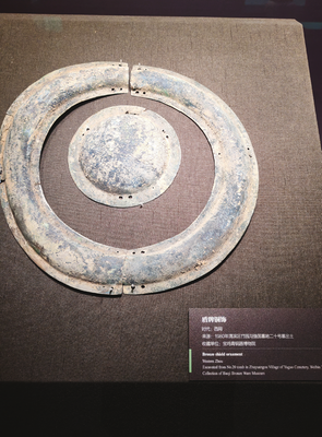这件盾牌铜饰于1980年出土于渭滨区竹园沟(弓鱼yu)国墓地二十号墓,呈现出环形与圆形组合的结构,表面有明显的锈迹与斑驳色泽。笔者了解到,作为盾牌的重要组成部分,它的象征意义与盾牌本身紧密相关:最核心的是保护与防御,这是盾牌的基本用途,也让铜饰成为安全感的代名词;其次是勇敢与力量,古代勇士手持盾牌冲锋陷阵的形象,让它成为无畏与坚韧的象征;再者是身份与遗产,盾牌上的纹饰或标记可区分家族与团体,使铜饰承载起历史记忆与文化传承的使命;同时,它还寓意着警惕与远见,鼓励人们主动应对生活中的挑战。